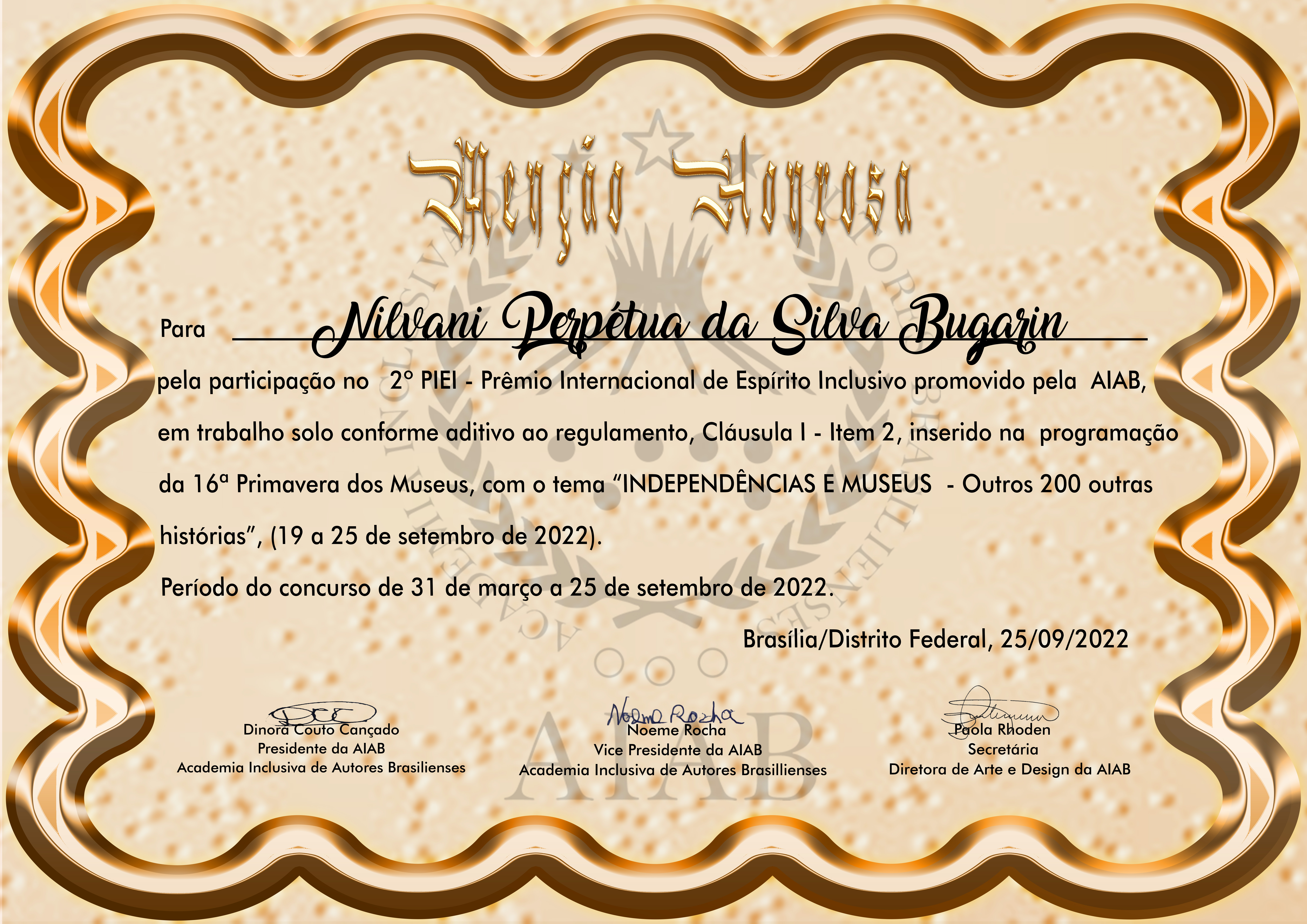 AIAB concede certificado de Menção Honrosa pela participação solo conforme Aditivo da Cláusula I - Item 2:
